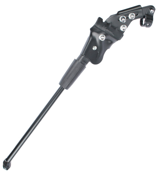 Боковая подножка с креплением на 2 пера заднего треугольника рамы велосипеда от производителя велоаксессуаров, фирмы Klonk. Крепление выполнено из стали, опорная часть из алюминия. Подножка не регулируется по длине. Оптимально подходит для установки на велосипеды с диаметром колес 26, 27.5". Возможна установка на велосипеды, с диаметром колёс 28, 29", но велосипед будет сильно наклонён при стоянке. Имеет регулировку верхнего фиксатора по длине и адаптацию под угол перьев рамы. Также возможна установка только за нижнее перо рамы (разборная конструкция). Для комфортной установки подножки при наличии дискового тормоза, нужно обратить внимание на его крепление, оно должно располагаться на верхнем пере (стандарт IS ). Подножка хорошо сочетается с круглыми, овальными и формированными перьями рам. Подходит для установки как на тонкие, так и на достаточно толстые перья. Обладает лаконичным дизайном, который хорошо сочетается с любым велосипедом.
