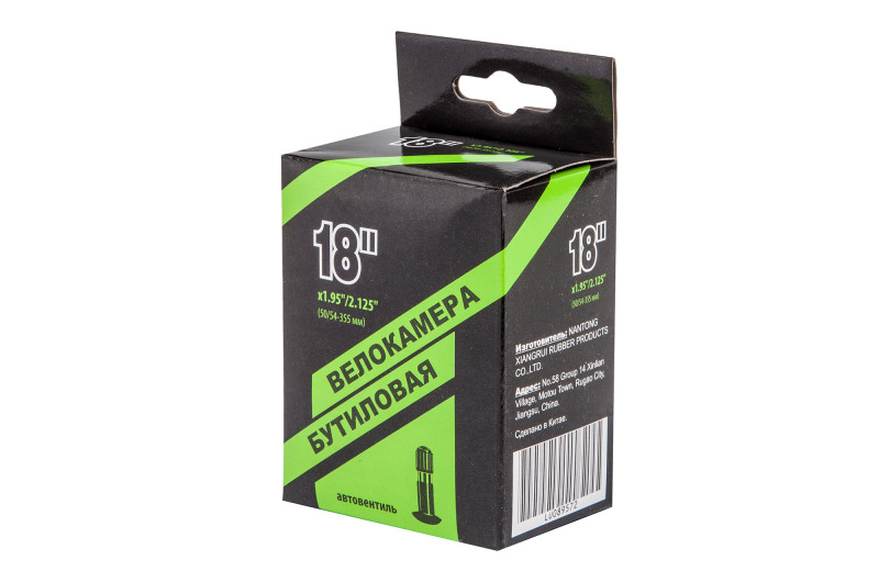 Базовая бутиловая камера NTG для детских, складных и мини велосипедов, также некоторых самокатов. Обладает размером под колеса 18" и, за счет хорошей тягучести резинового состава, внушительным диапазоном ширины - от 1,95" до 2,125". Ниппель прямой, стандарт AV, рассчитан для установки с ободами под автомобильный ниппель (Schrader). Ниппель хорошо удерживает давление, резиновый состав хорошо устойчив к проколам. Камера рассчитана на посадочный размер 50/54-355.