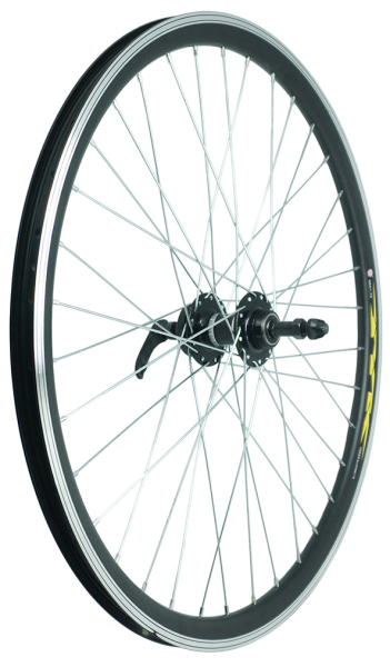 Заднее колесо 26 дюймов с двойным ободом изготовлено из алюминия. Совместимые кассеты 8-10 ск. Колесо подходит для установки на велосипед с дисковыми тормозами. Втулка колеса выполнена из алюминия.