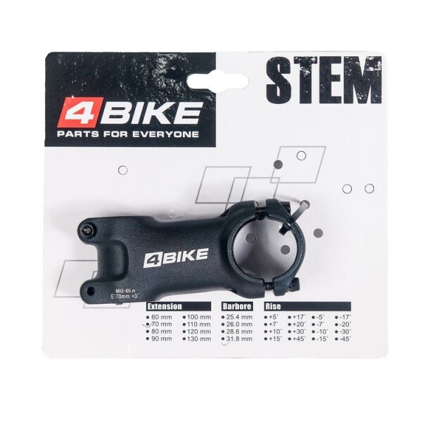 Вынос 4Bike TDS-D601 - высококачественное исполнение с низким весом. Найдет оптимальное применение во внедорожных направлениях, а также применим к любому велосипеду и стилю катания. Корпус из кованного алюминия, болты из прочной стали. Рассчитан на рулевые штоки 1 1/8" и для рулей с диаметром 31,8 мм. Шток прижимается двумя болтами, руль четырьмя. Длина выноса по точкам крепления 70 мм, подъем +3 градуса.