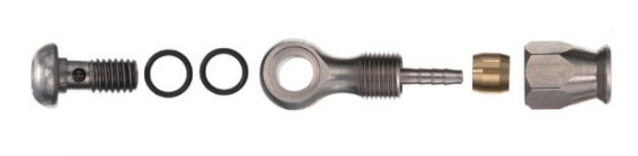 Комплект банджо, болта, двух уплотнительных резинок, оливки и гайки для гидролинии на калипер для Magura и Hayes. При замене калипера, укорачивании или замене гидролинии данные элементы станут необходимым и важным пунктом, без которых выполнение работы не будет возможным. При сборке данные элементы развальцовываются и герметизируют систему, за счет чего их повторное применение не возможно. Комплект рассчитан на 1 соединение.