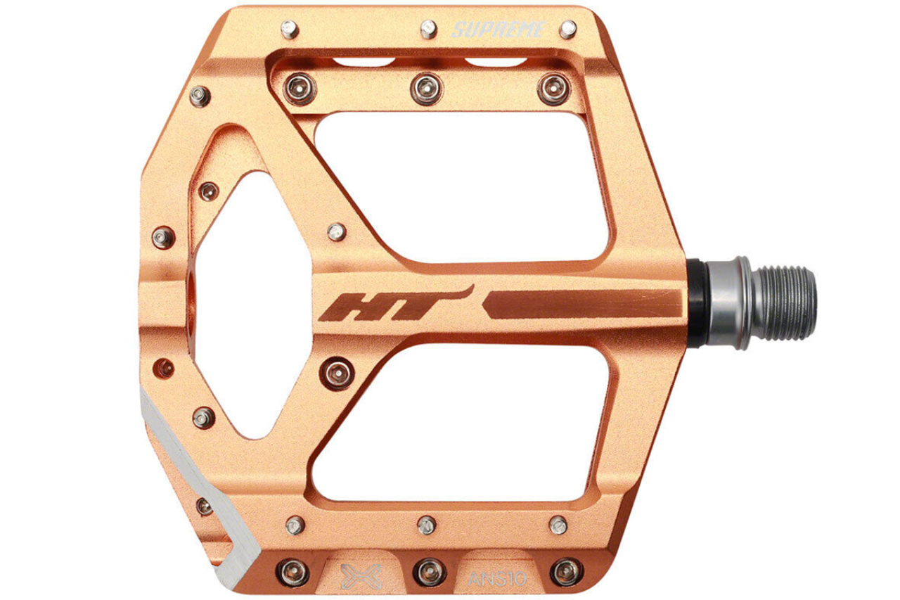 HT ANS10 - лучшее решение для агрессивного катания в MTB дисциплинах с постоянными прыжками и жесткими приземлениями. Станет отличным вариантом для для любителей даунхилла, фрирайда, дёрта и слоупстайла. Корпус педалей выполнен из алюминия с применением ЧПУ обработки. Собрана с использованием технологии EVO + - втулки скольжения IGUS работают в паре с упорным подшипником, что дает легкую плавность вращения и высокую устойчивость к влаге, пыли, грязи, ударным нагрузкам. Корпус фиксируется на Cr-Mo ось, выполненную с CNC обработкой и имеющую стандартную резьбу 9/16". К тому же в своем сегменте обладает уверенными преимуществами - вес пары 368 грамм, средняя высота профиля, площадка размером 100 х 100 мм, 20 сменных шипов на одну педаль. Оптимальный контакт и уверенную стойку на педалях получиться достичь при использовании специализированной, бесконтактной MTB обуви. Педали не комплектуются светоотражателями и в продажу поступают в различном цветовом решении.