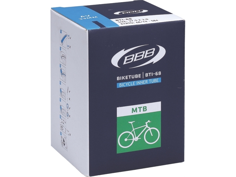 BBB BTI-68 - прочная бутилкаучуковая камера для MTB, городских, прогулочных велосипедов. Обладает размером 27,5" и, за счет хорошей тягучести резинового состава, внушительным диапазоном ширины - от 2,10" до 2,35". Ниппель FV, рассчитан для установки с ободами под велосипедный ниппель (Presta). Ниппель имеет длину 33 мм, хорошо удерживает давление, резиновый состав имеет толщину 0,81 мм, устойчива к проколам и легко поддается заклейке. Камера рассчитана на посадочный размер 54/64-584.