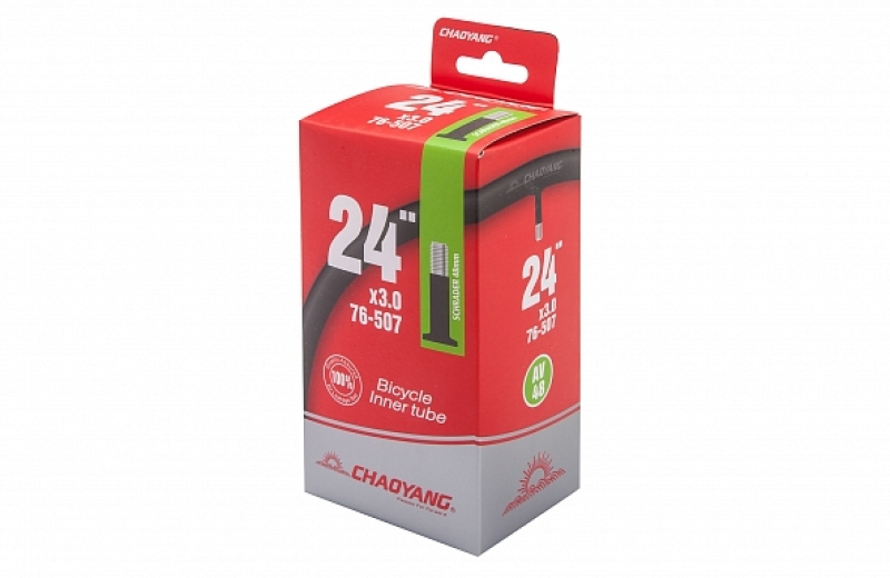 Базовая бутиловая камера Chao Yang для подростковых велосипедов с плюсовым стандартом колес (полуфэтов). Обладает размером под колеса 24" и ширину 3.0". Ниппель прямой, длина 48 мм, стандарт AV, рассчитан для установки с ободами под автомобильный ниппель (Schrader). Ниппель хорошо удерживает давление, резиновый состав хорошо устойчив к проколам. Камера рассчитана на посадочный размер 76-507.