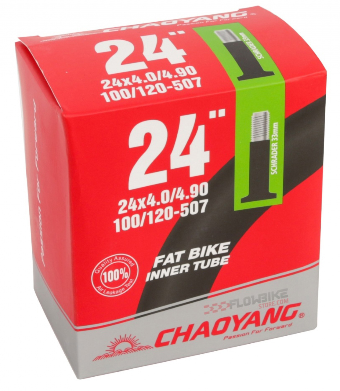 Базовая бутиловая камера Chao Yang для подростковых Fat байков. Обладает размером под колеса 24" и рассчитана на диапазон ширины от 4.0" до 4.9". Ниппель прямой, стандарт AV, рассчитан для установки с ободами под автомобильный ниппель (Schrader). Ниппель хорошо удерживает давление, резиновый состав хорошо устойчив к разрыву. Камера рассчитана на посадочный размер 100/120-507.