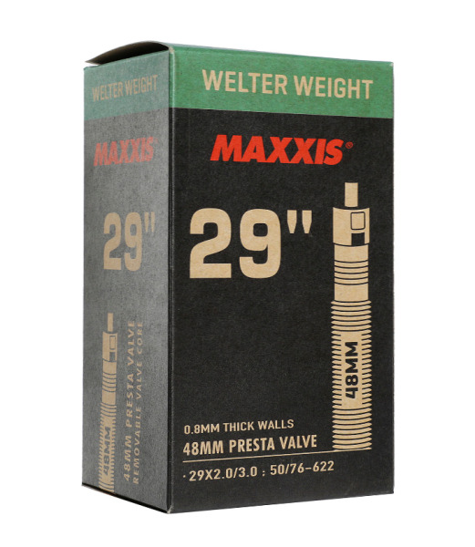 Прочная и легкая бутилкаучуковая камера Maxxis Welter Weight для горных, треккинговых, прогулочных, городских и туринговых велосипедов. Обладает размером под колеса 29" и, за счет хорошей тягучести резинового состава, диапазоном ширины - от 2.0" до 3.0". Ниппель стандарта F/V (Presta), имеет длину 48 мм, рассчитан для установки с ободами под авто ниппель. Ниппель хорошо удерживает давление, резиновый состав имеет толщину стенки 0,8 мм, устойчив к проколам и легко поддается заклейке.