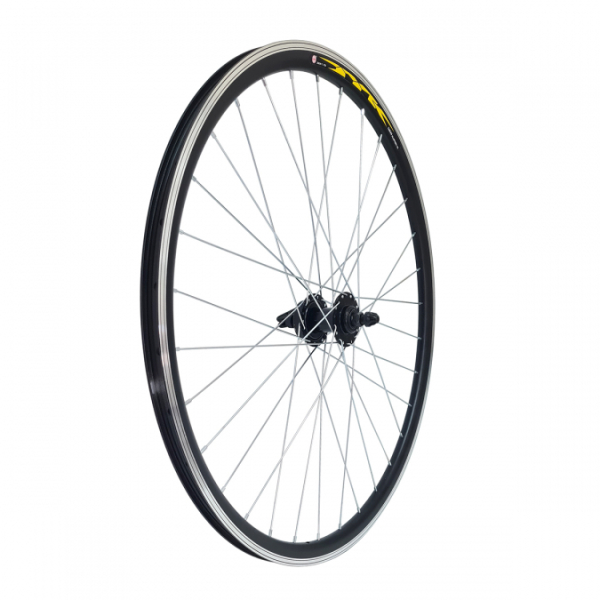 Колесо переднее в сборе для подростковых, городских и складных велосипедов. Имеет двойной обод для максимальной прочности. Спицы выполнены из стали и толщиной 2мм. Втулка выполнена в корпусе из алюминиевого сплава и методом фрезеровки имеет 36 отверстий. Ось выполнена из стали и для максимальной практичности в использовании имеет эксцентриковый зажим для откручивания которого не потребуется применение инструмента. Втулка имеет накатистые насыпные регулируемые подшипники. Колесо используется с дисковыми тормозами, крепление ротора на 6 болтов.