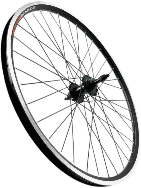 Универсальное заднее колесо Trix в сборе, готовое к установке. Имеет стандартный размер 26". Лучше всего подойдет для MTB, треккинговых, гравийных и городских велосипедов. Рассчитано для установки трещотки и в рамы с шириной меду перьями 135 мм. (O.l.d). Втулка оснащена алюминиевым корпусом с 36 отверстиями, насыпными подшипниками, креплением тормозного ротора на 6 болтов. Ось выполнена из стали, фиксируется гайками 15 мм. Спицы стандартные стальные 2 мм 14G. Обод Trix, алюминиевый с двойной стенкой, не пистонированный, под автомобильный ниппель камеры. Параметры обода 19,6/22,8х20,2 мм. Оптимальным сочетанием будут покрышки с шириной от 1,95, поддерживает колесо оптимальную нагрузку до 100 кг. Выпускаются колеса полностью в черном цвете. Стоит заметить, что колесо полностью готово к установке, оно собрано и протянуто. В сборку не входят: ободная лента, камера, покрышка, кассета и болты для ротора.