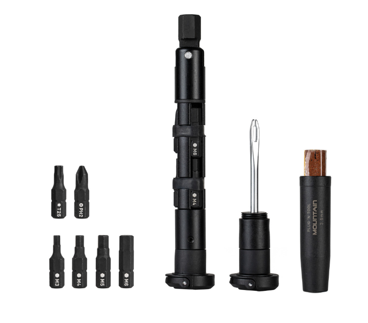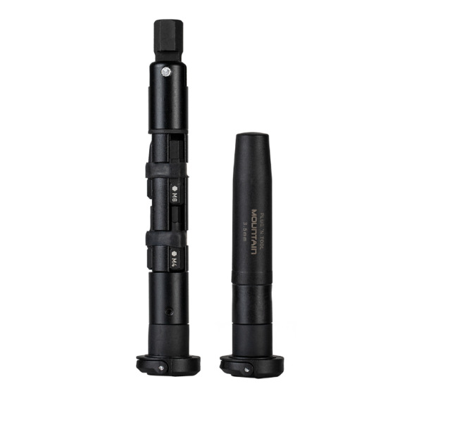 Набор инструментов в руль горного велосипеда Topeak Plug'n Tool Mountain - лучший набор инструментов интегрируемый в руль вместо баренд (заглушек руля). Установка производится сразу с двух сторон интегрируемыми корпусами из стеклопластикового композита. В корпуса вмещаются: набор шестигранных ключей выполненных из закалённой стали 3, 4, 5, 6, 10 мм, Torx T25, шило 3,5 мм с жгутами для ремонта бескамерных покрышек. Корпусы совместимы с внутренним диаметром рулей 18 - 21,2 мм, максимальная длина 128 мм. Для быстрого доступа к отсекам с инструментами на торце имеется откидная ручка, которой удобно пользоваться даже в перчатках.