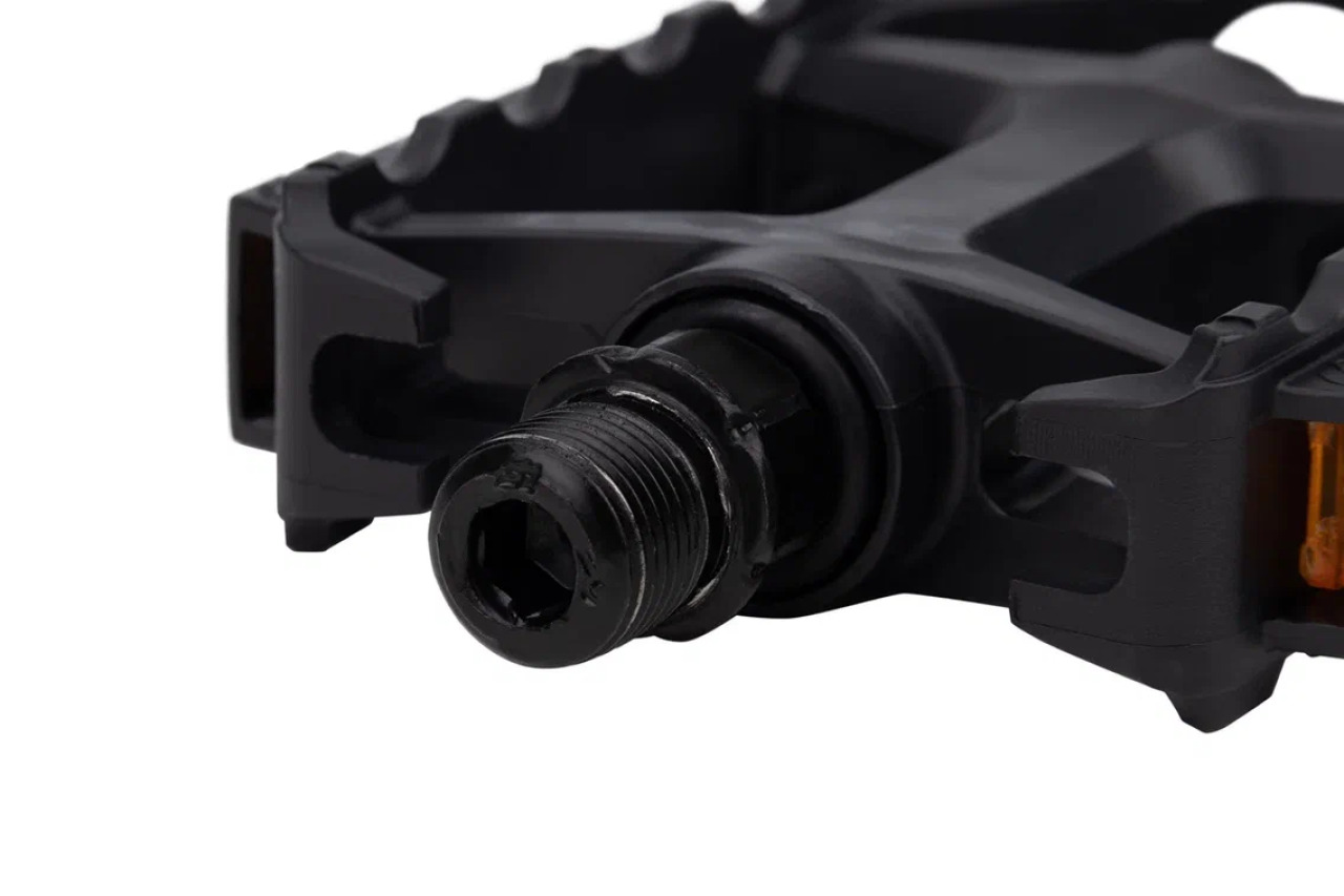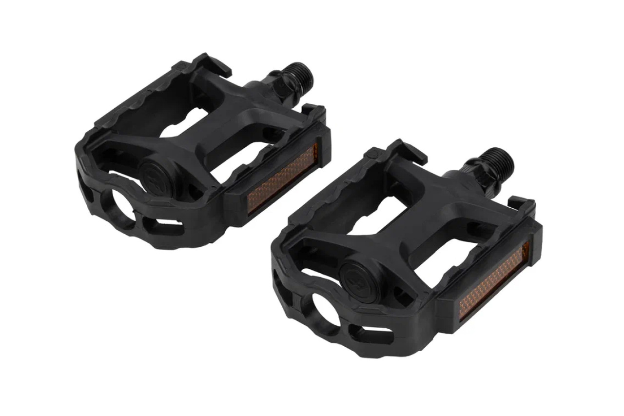 Педали пластиковые OYYO PD01 - бюджетное решение для комфортного и прогулочного катания в городе. Корпус педалей выполнен из пластика. Собраны с использованием двух насыпных шариковых подшипников. Имеют стандартную стальную ось с резьбой 9/16". Широкая площадка педали комфортно распределяет нагрузку на подошву и позволяет ноге не скользить. Для пассивной безопасности, по регламенту производства, добавлены катафоты оранжевого цвета.