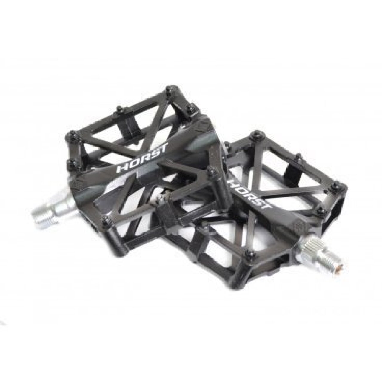 Детские педали Horst Н36. Высокий корпус педалей выполнен из алюминия, собраны с использованием двух промышленных подшипников, имеют стальную ось с резьбой 1/2". 16 несменных шипов на 1 педали позволяют иметь хороший контакт с обувью, а внушительная ширина платформы удобна при постоянной стойке на велосипеде. Комплект обладает сравнительно привычным дизайном и оптимальными показателями в соотношении надежности к весу. Педали не комплектуются светоотражателями и выпускаются в различных расцветках под разный стиль велосипеда.