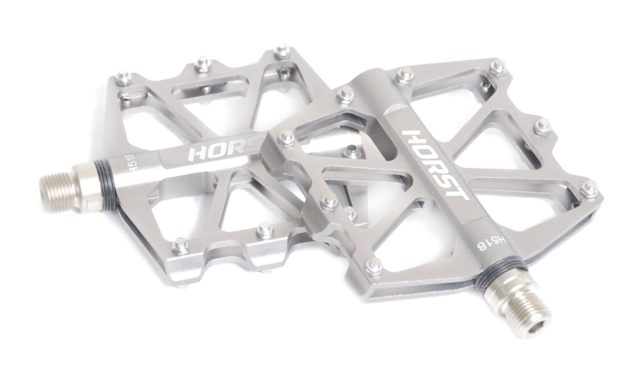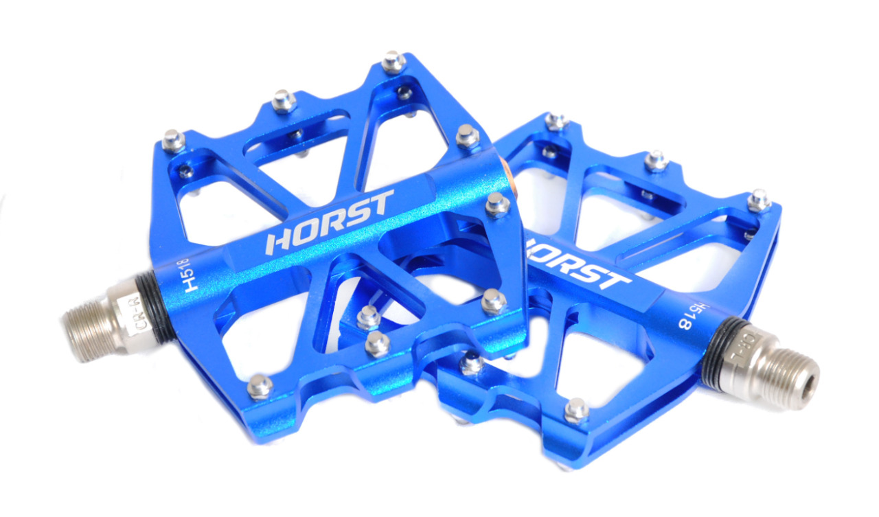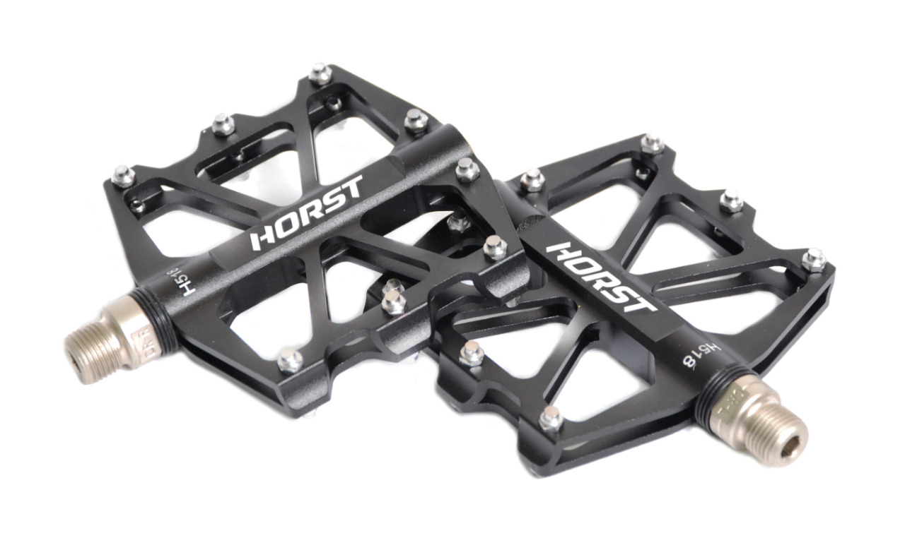 Педали H518 от именитого производителя качественных компонентов Horst — это прекрасные педали-топталки с не обыкновенным дизайном. Платформа выполнена из алюминиевого сплава для облегчения конструкции. Данные педали прекрасно подойдут для катания на горном велосипеде начального и любительского уровня. Каждая педаль имеет 8 съёмных шипов с одной стороны и с другой стороны, которые обеспечивают прекрасное сцепление обуви с педалью. Ось выполнена из высокопрочного хром-молибденового сплава (Cr-Mo), а на торце находится отверстие под 6 мм шестигранник и 15 мм для накидного ключа. В конструкции используются два долговечных промышленных подшипника закрытого типа обеспечивающие отличную торсионную жесткость и длительный срок службы. Стандарт резьбы на оси: 9/16" дюймов.