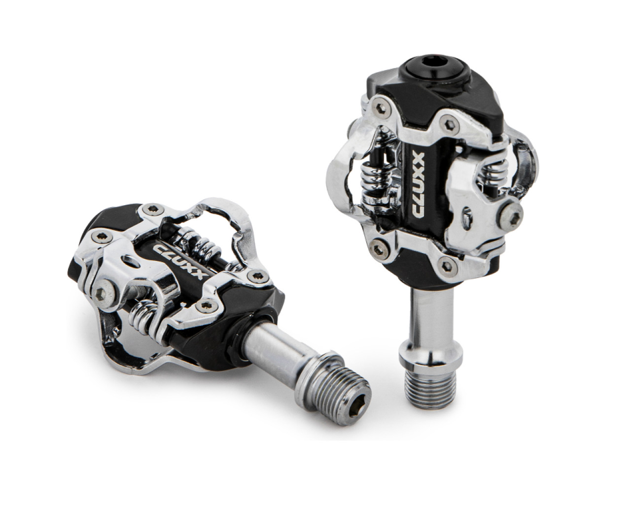 Износостойкие контактные педали Rally 100 от компании Cluxx начального уровня. Отлично подойдут для ознакомления с контактами и контактной обувью стандарта SPD. Увеличенные рамки дают большую надежность, что актуально для MTB и гревел дисциплин. Разборная обслуживаемая конструкция из кованного алюминиевого сплава и промышленные подшипники в корпусе продлевают срок эксплуатации данных педалей. Ось выполнена из хромомолибденовой стали с ЧПУ обработкой. Размеры одной педали составляют 85х68х34 мм, а вес 358 грамм. Регулировка усилия выстёгивания одним шестигранником. Шипы для обуви идут в комплекте.