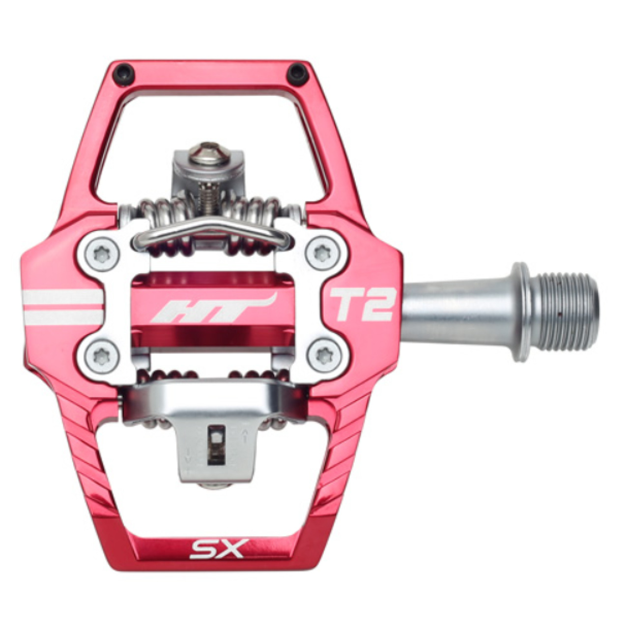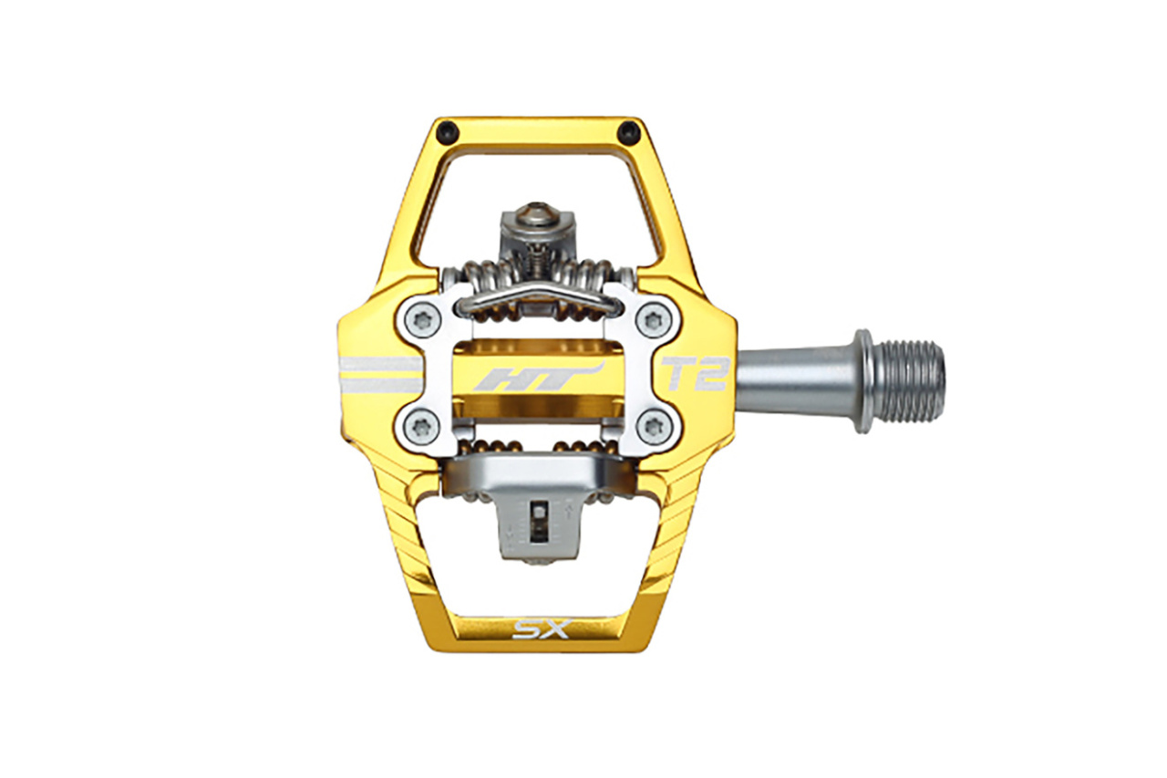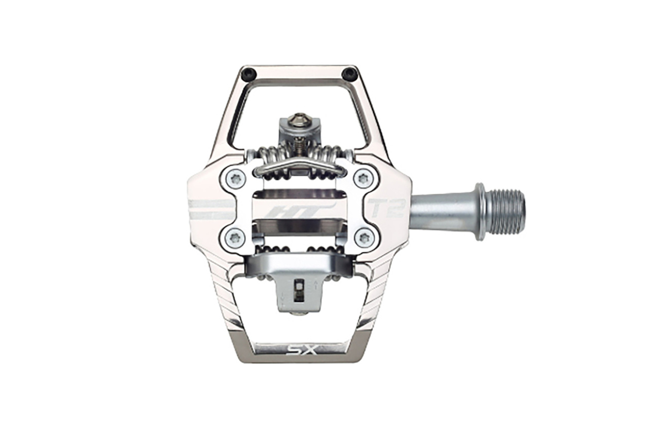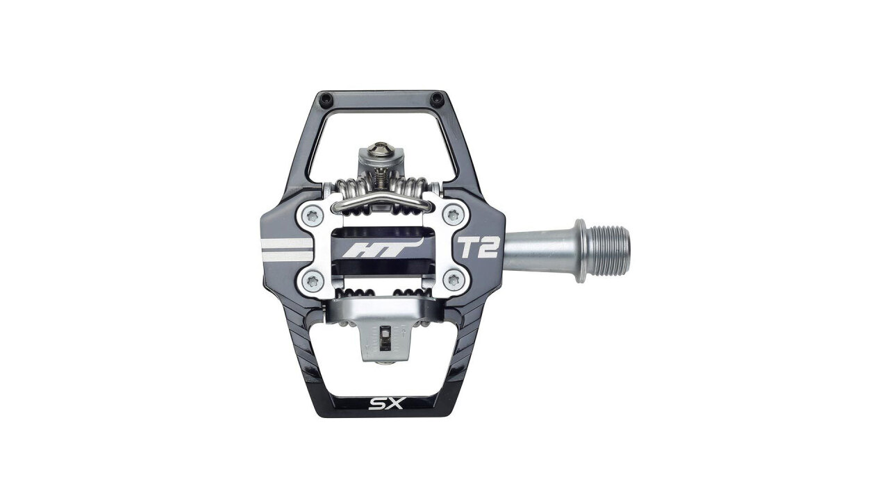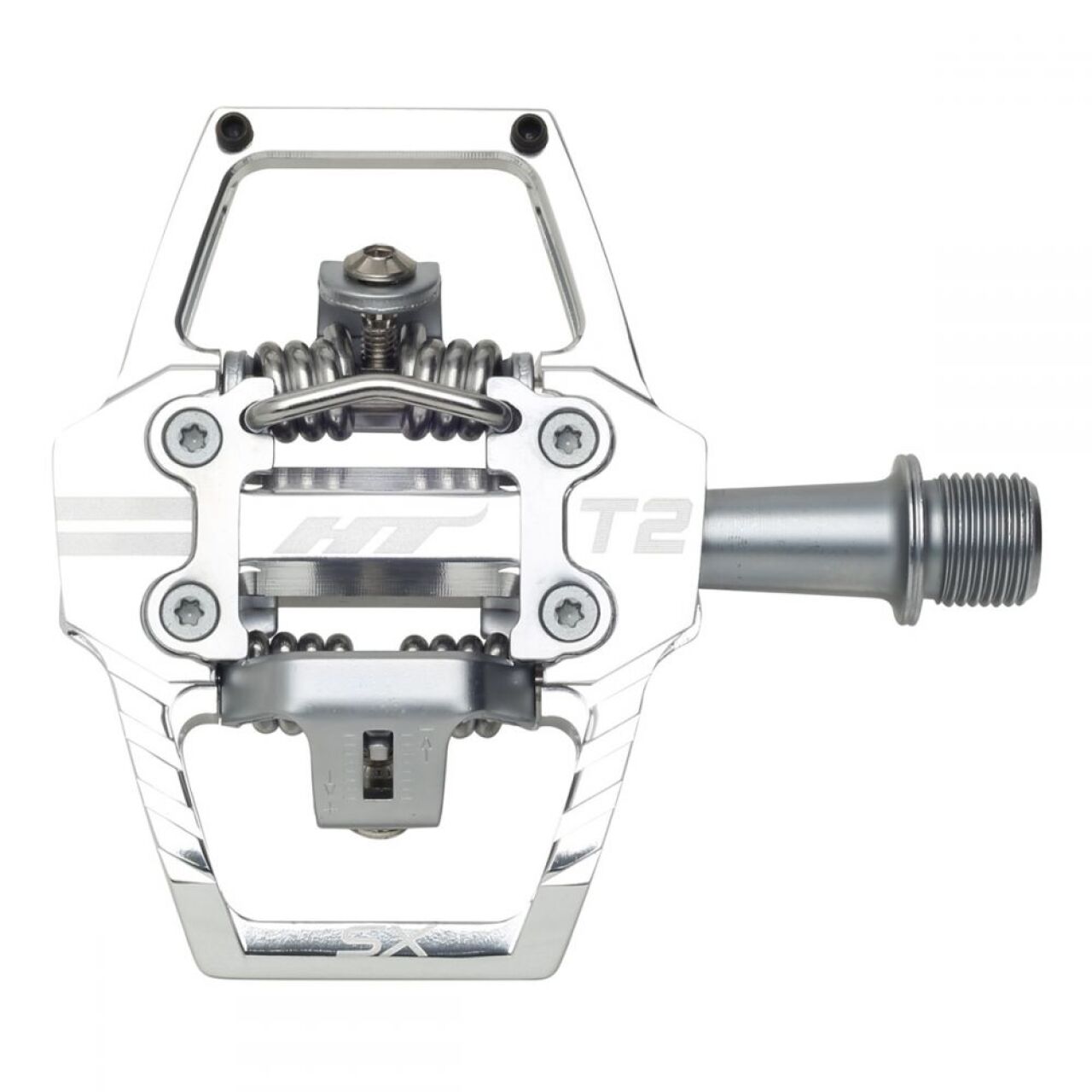 T2SX от именитого производителя профессиональных компонентов HT - пожалуй лучшее эффективное решение из контактных педалей для дисциплин трейл, эндуро и АМ. Платформа выполнена из легкого алюминиевого сплава, двусторонняя система зацепов из прочного Cr-Mo сплава. Рамка позволяет снизить нагрузку на стопу при жестких приземлениях и постоянном педалировании, а также осуществляет дополнительную защиту замка. Фиксируется корпус через герметичные промышленные подшипники и втулку скольжения igus, на стальную Cr-Mo ось, которые также в совокупности долго и беспроблемно служат в любых условиях. Система фиксации имеет регулировку усилия встегивания и выстегивания. Совместимы с фирменными шипами стандарта HT exclusive system - X1E / X1 / X1F. Обратите внимание, данные педали и система крепления несовместимы со стандартом SPD от Shimano.
