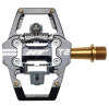 T2T от именитого производителя профессиональных компонентов HT - пожалуй лучшее эффективное решение из контактных педалей для дисциплин трейл, эндуро и АМ. Платформа выполнена из легкого алюминиевого сплава, двусторонняя система зацепов из прочного титанового сплава. Рамка позволяет снизить нагрузку на стопу при жестких приземлениях и постоянном педалировании, а также осуществляет дополнительную защиту замка. Фиксируется корпус через герметичные промышленные подшипники и втулку скольжения igus, на титановую ось, которые также в совокупности долго и беспроблемно служат в любых условиях. Система фиксации имеет регулировку усилия встегивания и выстегивания. Совместимы с фирменными шипами стандарта HT exclusive system - X1E / X1 / X1F. Обратите внимание, данные педали и система крепления несовместимы со стандартом SPD от Shimano.