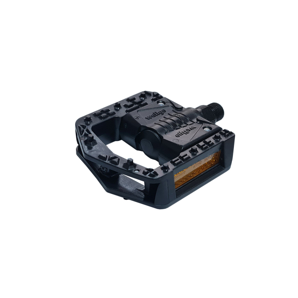 Педали Wellgo F284DU - элемент для начального и любительского уровня складных велосипедов. Корпус педалей выполнен из пластика, собраны с использованием пром. подшипников, имеют стальную ось с резьбой 9/16". Рельефный контур педали позволяют иметь хороший контакт с обычной, повседневной обувью, а внушительная ширина платформы удобна при стойке и педалировании на велосипеде. Складной механизм педалей надежен и удобен в использовании, не люфтит и не деформируется. По регламенту безопасности движения педали комплектуются светоотражателями, выпускаются в стандартном черном цвете.