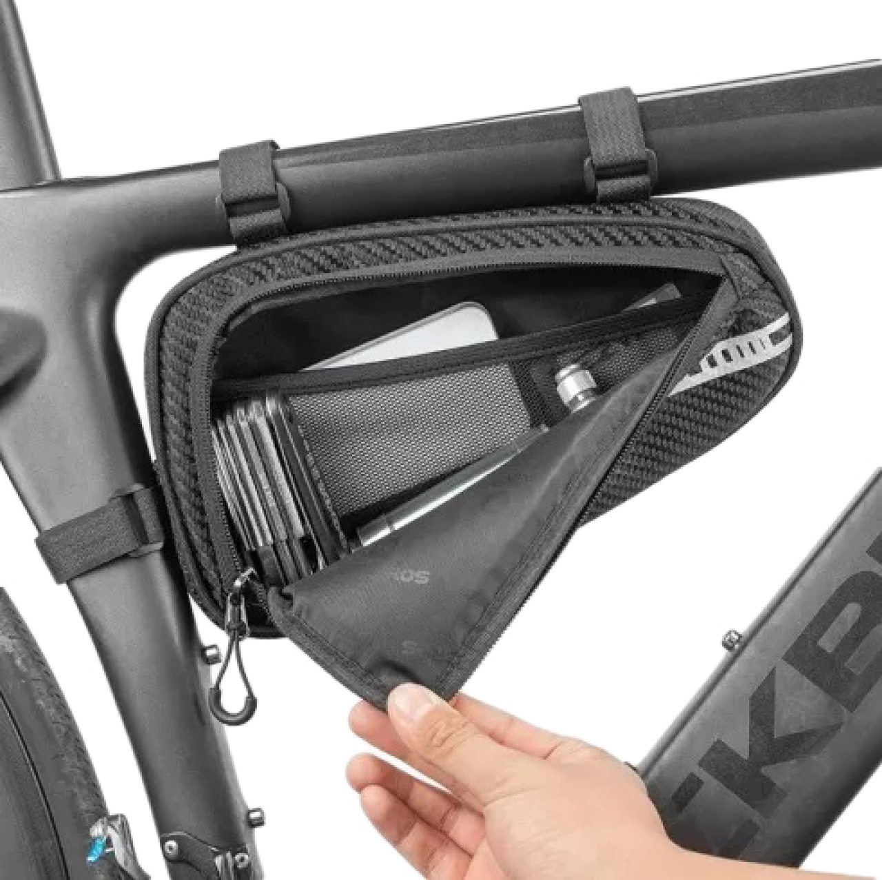 Сумка под раму Rockbros B75 позволит всегда иметь с собой те вещи которые необходимы в дороге, инструменты, личные вещи, уместится всё вместе благодаря двум раздельным отделениям. Трехслойный сэндвич из плотного непромокаемого полиэстера, поролоновой прослойки 5мм и приятной на ощупь внутренней отделке вещи останутся в целостности. Молния имеет защиту от промокания с удобным пуллером на бегунке. Крепится данная сумка в основном внутри переднего треугольника рамы. Размеры 260мм в длину, высота 150мм, ширина 50мм, а объем пространства составляет 1.2 литра. Крепление происходит на 3 гибких липучках с регулируемым диаметром охвата, по этому подходит для большинства велосипедных рам.