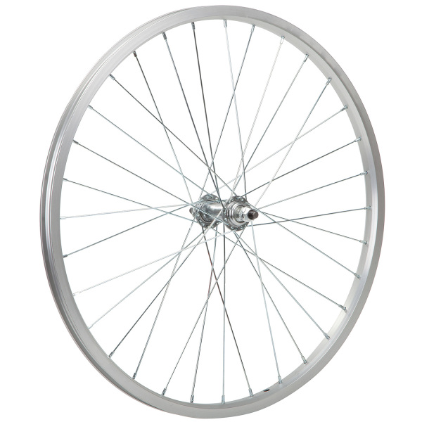 Переднее колесо 24” под V-brake тормоза с болтовым креплением отлично подходит для подростковых велосипедов начального уровня с максимальной нагрузкой до 90 кг. Обод колеса одинарный и выполнен из алюминия с 32 отверстиями под спицы. Втулка выполнена из стали и собрана на насыпных подшипниках. Внешняя ширина обода составляет 25 мм, а внутренняя 19 мм. Ширина втулки составляет 100 мм.