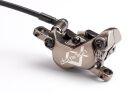 Комплект профессиональной гидравлической тормозной системы Hayes Dominion A4. Подходит для всех скоростных и экстремальных MTB направлений. Отличительная черта данной тормозной системы кроется в широкой зоне регулировки тормозной ручки, рассчитанной на управление 2-мя пальцами. А также 4-х поршневом калипере, имеющим возможность отдельной прокачки левого и правого контура. Тормоз обладает длиной гидролинии 1800 мм и рассчитан на задний тормозной контур. Полимерные колодки совместимы с большим количество моделей роторов. Калипер рассчитан на установку в крепление стандарта PM. Комплект состоит из правой тормозной ручки, гидролинии, калипера и комплекта тормозных колодок с пружинами. При установке и подгонке длины гидролинии стоит иметь в виду, что тормозная система работает на тормозной жидкости DOT 5.1