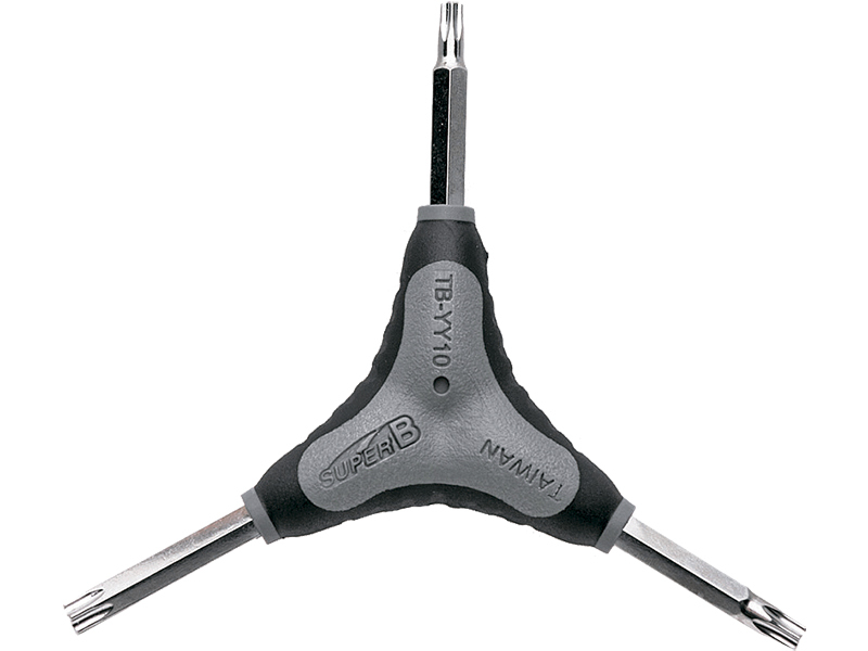 Торцевой Y-ключ TB-YY10 от компании Super B - предназначен для работы с болтами Тorx и имеет три размера 25/30/40" и является незаменимым инструментом в любой мастерской. За удобный хват отвечает пластиковая центральная ручка с противоскользящими прорезиненными участками. Основной материал инструмента высокопрочная Cr-mo сталь.