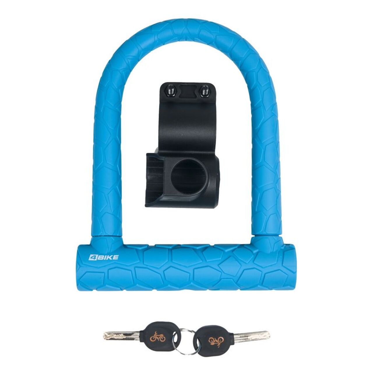 Велозамок 4Bike 610 – недорогой и конструктивно надежный элемент защиты вашего велосипеда на парковке. Имеет простой и понятный запорный механизм типа Multi Lock под ключ, которых в комплекте поступает 2 штуки. Замок относится к типу U-lock, выполнен из стального, каленого прута толщиной 20 мм. Скоба имеет небольшие габариты 150 х 98 мм и мягкое силиконовое покрытие для защиты ЛКП рамы. В комплекте поставляется крепление для аксессуара на раму велосипеда. Поставляется в черном или голубом цвете.