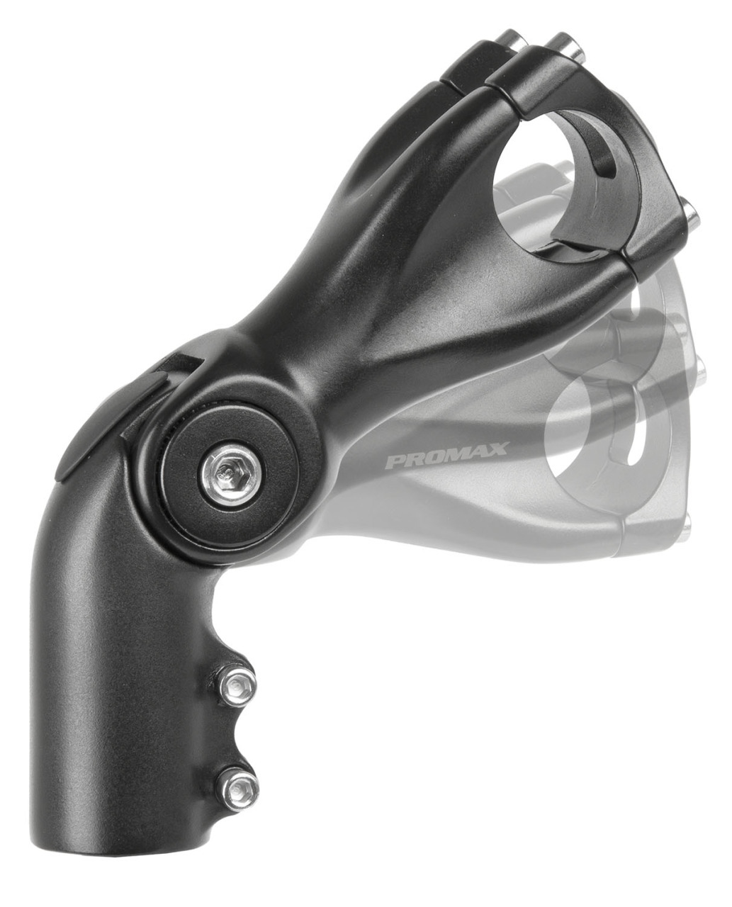 Вынос Promax для комфортных, MTB, городских, треккинговых и туринговых велосипедов. Корпус из алюминия, болты из прочной, нержавеющей стали. Рассчитан на рулевые штоки 1 1/8" и для прямых, треккинговых и комфортных рулей с диаметром 31,8 мм. Шток прижимается двумя болтами, руль - четырьмя. Длина выноса по точкам крепления 90 мм, подъем регулируется в диапазоне от +25 до +90 градусов, ко всему, расположение точки крепления дополнительно приподнято относительно шарнира регулировки, что придает значительный комфорт посадке. Регулировка угла наклона выполнена достаточно просто и надежно, фиксируется одним шестигранным ключом. В продажу поступает в черном цвете с маркировкой положения и момента затяжки крепежа.